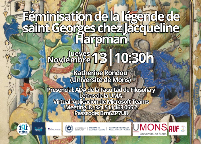 - Rondou, K. (13 November 2025). "Féminisation de la légende de saint Georges chez Jacqueline Harpman" [Paper presentation]. Cycle de conférences de gender studies en ligne, Malaga, Spain.